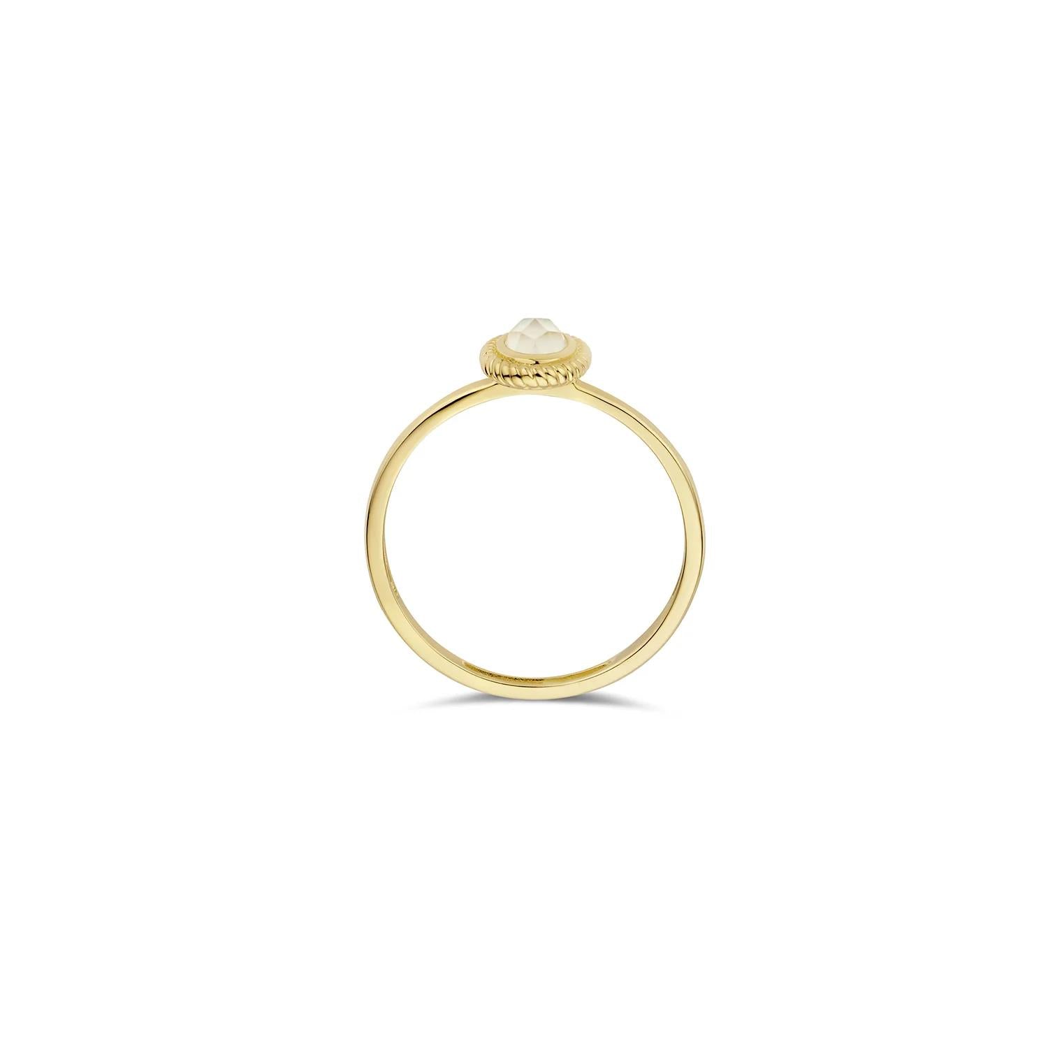 Deze 14k geelgouden ring met pure kwarts en parelmoer heeft een moderne zetting met een kabelmotief. De doorsnede van de band is 1.3 mm en de steen is 6.2 mm bij 7.9 mm. Prachtig op zichzelf maar ook mooi te combineren met andere ringen uit onze collectie. Onze sieraden Alle sieraden van Blush zijn met aandacht en liefde gemaakt van 14k goud - geel, rosé of wit. Hoge kwaliteit waarvan je jarenlang plezier hebt staat bij ons voorop net als de mogelijkheid om eindeloos te mixen en te matchen. Een sieraad van Blush is een cadeau voor jezelf of een ander en komt daarom altijd in een cadeauverpakking. Product ID: 1239YMQ Diameter: ⌀ 1.3 mm Grootte detail/applique: 6.2 mm, 7.9 mm Type goud: 14k Geel goud Type steen: Mother of Pearl en Pure quartz Zetting: Glad omzetting