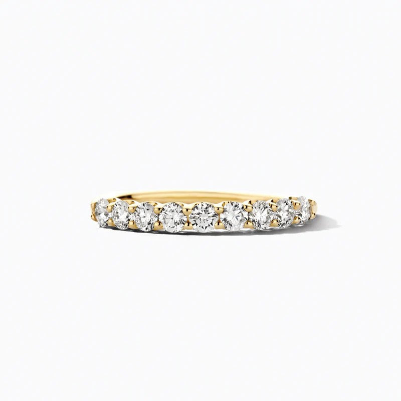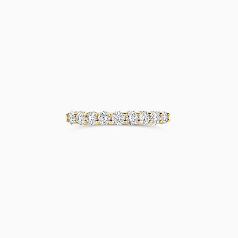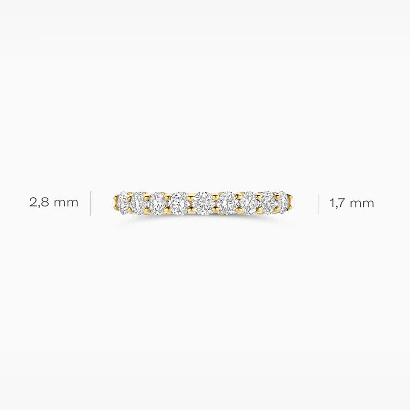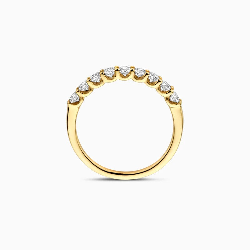 Ontdek deze verfijnde 14k geelgouden ring, gezet met negen schitterende lab-grown diamanten in een elegante pavé-zetting. Elke diamant heeft een diameter van 2.8 mm en samen vormen ze een totale diamantgewicht van 0.72 ct. De slanke band van 1.7 mm zorgt voor een subtiel en luxueus profiel dat moeiteloos bij elke stijl past.