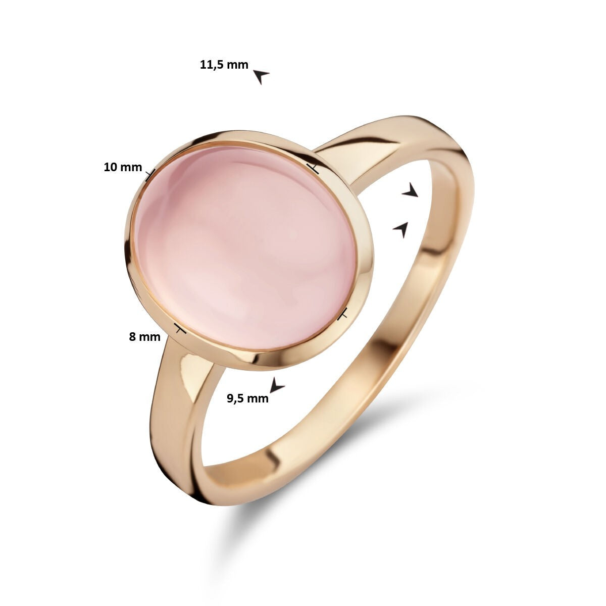 14 Karaat Roségouden Ring met Rozenkwarts – Maat 55 Deze elegante **ring** is vervaardigd uit **14 karaat roségoud (585/1000)** en gezet met een prachtige **rozenkwarts**. De steen heeft een zachte roze kleur die perfect past bij de warme glans van roségoud en straalt verfijning en vrouwelijkheid uit. De rozenkwarts is **cabochon geslepen** en ovaal van vorm, met een afmeting van **10 x 8 mm**, geplaatst in een klassieke **zetkast**. De ring heeft een totale afmeting van **11,5 x 9,5 mm**, wat zorgt voor een stijlvolle en draagbare uitstraling. Met een gewicht van ca. **2,52 g** en maat **55 (17½)** sluit dit sieraad mooi aan en biedt het dagelijks draagcomfort. Specificaties * Type sieraad: Ring * Materiaal: 14 karaat roségoud (585/1000) * Edelsteen: Rozenkwarts * Slijpvorm: Cabochon * Vorm: Ovaal * Afmetingen steen: 10 x 8 mm * Ringafmetingen: 11,5 x 9,5 mm * Zetwijze: Zetkast * Kleur steen: Roze * Ringmaat: 55 (17½) * Gewicht: ca. 2,52 g * Afwerking: Gepolijst Over Juweliershuys Van Veen Simons Dé Juwelier van het Groene Hart, Waddinxveen en omstreken. Als familiebedrijf, juwelier en atelier bieden wij vakmanschap, persoonlijke service en kwaliteit. 14 karaat roségouden ring met ovale rozenkwarts (10 x 8 mm), cabochon geslepen, maat 55. Elegant en vrouwelijk design. Dé Juwelier van het Groene Hart, Waddinxveen en omstreken.