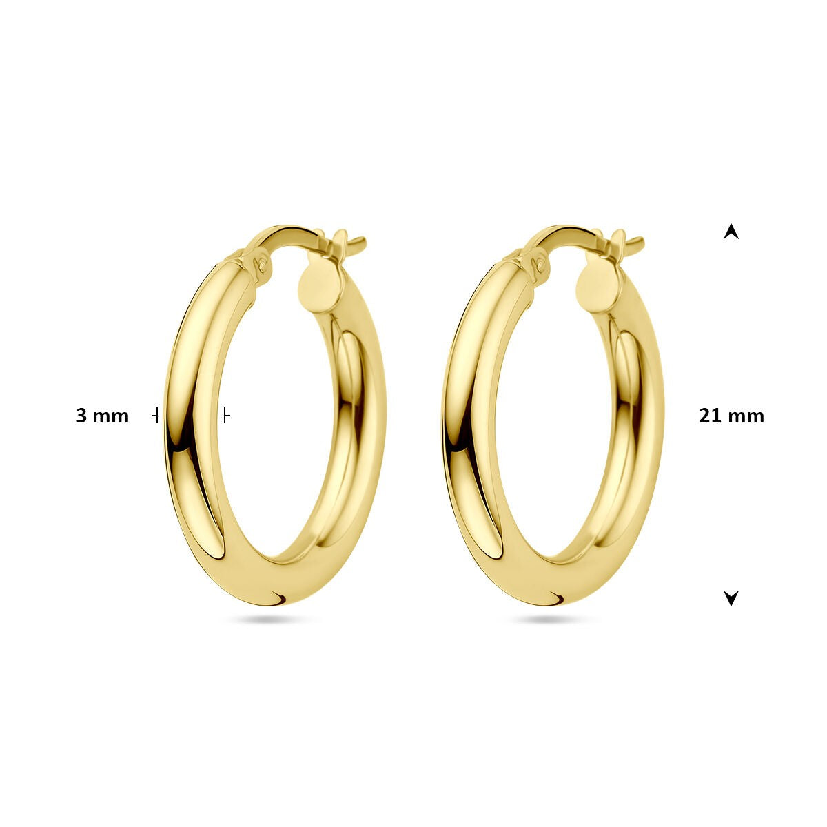 Deze ronde oorringen zijn vervaardigd uit 14 karaat geelgoud en uitgevoerd in een klassieke buisvorm met een dikte van 3,0 mm. Dankzij de gepolijste afwerking hebben de oorringen een luxe glans en een tijdloze uitstraling die past bij elke gelegenheid.