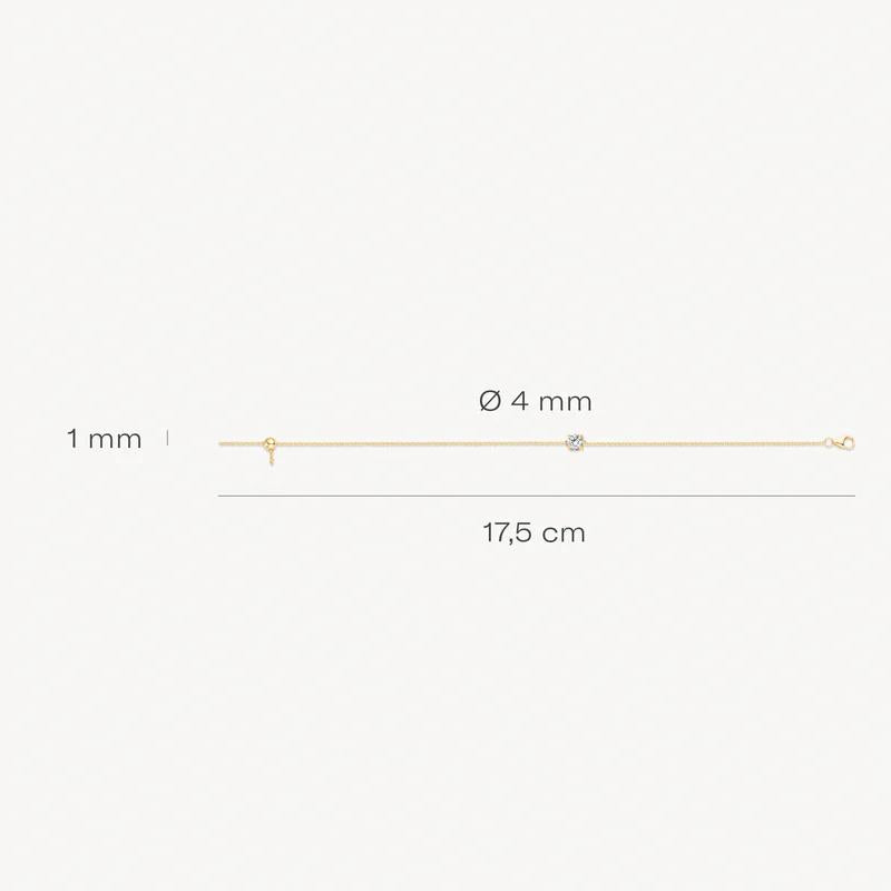 14k Geelgoud met Zirkonia Armband 2166YZI. Deze subtiel elegante armband van 14k geelgoud heeft een sprankelende zirkoniasteen in een chatonzetting. De armband is 17,5 cm lang en de zirkonia heeft een doorsnede van 4 mm. Mooi op zichzelf of in combinatie met andere geelgouden sieraden uit onze collectie. Type goud: 14k Geel goud Type zetting: Chaton-zetting Type steen: Zirkonia Steen grootte: ⌀ 4 mm Diameter: ⌀ 1 mm