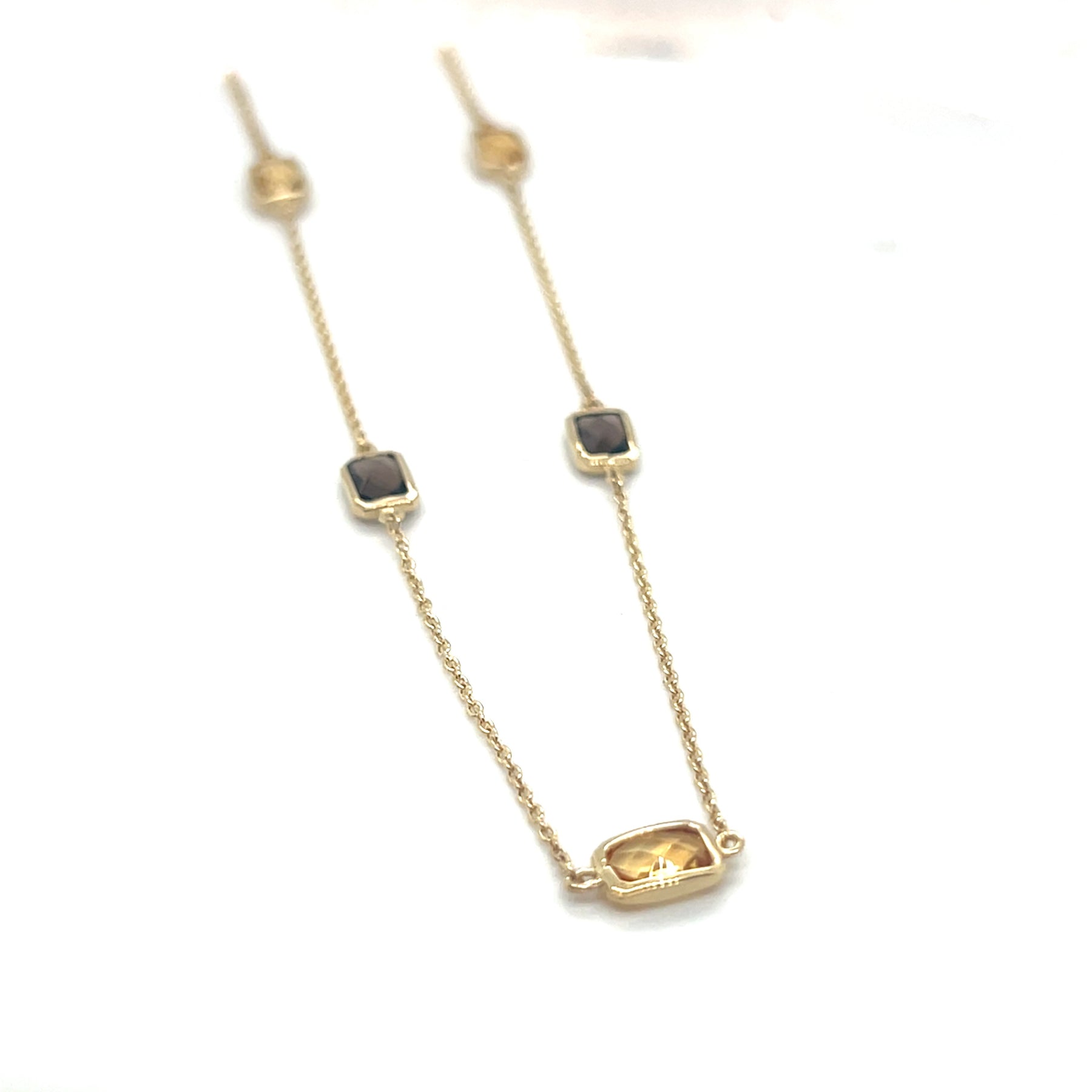 Dit elegante 14-karaats geelgouden collier van 45 cm lang is voorzien van rechthoekige edelstenen in citrien en rookkwarts. De stenen hebben een afmeting van 5 x 6,5 mm en zijn gezet in een strak, verfijnd ontwerp. Dit tijdloze en stijlvolle sieraad combineert warmte en kleur, perfect voor zowel dagelijks draagcomfort als speciale gelegenheden. Je vindt dit prachtige collier bij Dé Juwelier van het Groene Hart, JuweliersHuys van Veen Simons in Waddinxveen. Als familiebedrijf, juwelier en atelier, garanderen wij vakmanschap en persoonlijke service.