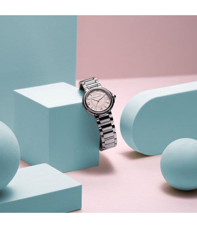 Maurice Lacroix Fiaba Round FA1104-SS002-F20-1 **Omschrijving:** Het Maurice Lacroix Fiaba Round FA1104-SS002-G20-1 horloge voor dames onderscheidt zich door zijn elegante en precieze ontwerp. Het valt vooral op door het sierlijke ontwerp en de diamanten op de wijzerplaat. Dit elegante model zal elke pols van een vrouw sieren. Het Maurice Lacroix Fiaba Round FA1104-SS002-G20-1 horloge heeft een kast gemaakt van roestvrij staal, die wordt aangevuld met een armband van hetzelfde materiaal. Binnenin tikt de Zwitserse Ronda 703 batterij-aangedreven uurwerk betrouwbaar. De lichtroze wijzerplaat wordt beschermd door een saffierglas met een anti-reflecterende coating, die maximaal krasbestendig is. De binnenring van de wijzerplaat is bezet met 46 Wesselton-kleurige diamanten, die het horloge grandeur geven. De waterdichtheid van dit model is 50 m (5ATM), wat betekent dat het alleen basiscontact met water aankan, zoals handen wassen of een snelle douche. **Specificaties:** **Algemene informatie:** - **Merk:** Maurice Lacroix - **Geslacht:** Dames - **Stijl:** Casual - **Herkomst:** Zwitsers - **Garantie:** 5 jaar - **Waterdichtheid:** 50 m (5ATM) **Uurwerk:** - **Uurwerk:** Quartz - **Kaliber:** Ronda 703 - **Nauwkeurigheid van het uurwerk:** ±15 sec. / maand **Wijzerplaat en kast:** - **Kastgrootte:** 32 mm - **Kastdikte:** 10 mm - **Kastvorm:** Rond - **Kastmateriaal:** Roestvrij staal - **Glasmateriaal:** Saffier - anti-reflecterend - **Wijzerplaat:** Analoog - **Wijzerplaatkleur:** Licht roze - **Transparante kast:** Nee **Band:** - **Bandmateriaal:** Roestvrij staal - **Sluiting:** Vouwsluiting - **Bandbreedte:** 17 mm - **Bandkleur:** Zilver **Bijzonderheden:** - De binnenring van de wijzerplaat is bezet met 46 Wesselton-kleurige diamanten, wat het horloge een elegante uitstraling geeft. - De lichtgroene wijzerplaat voegt een unieke en verfijnde touch toe aan het algehele ontwerp van het horloge. Dit horloge combineert luxe met functionaliteit, waardoor het een perfecte aanvulling is op elke elegante garderobe.
