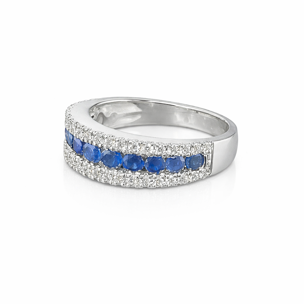 14 kt witgouden ring gezet met 11 x circa 9.4ct saffier