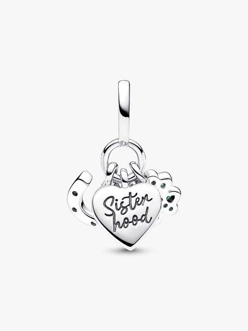 De hangende bedel bestaat uit een klavertjevier, een hart en een hoefijzer. Het hart is gegraveerd met het woord ‘Sisterhood’ en sprankelt met een witte synthetische opaal. Het hoefijzer is bezet met heldere cubic zirconia, terwijl het klavertjevier is afgewerkt met koninklijk groene kristallen. Samen vormen deze elementen een kleurrijk en symbolisch geheel.