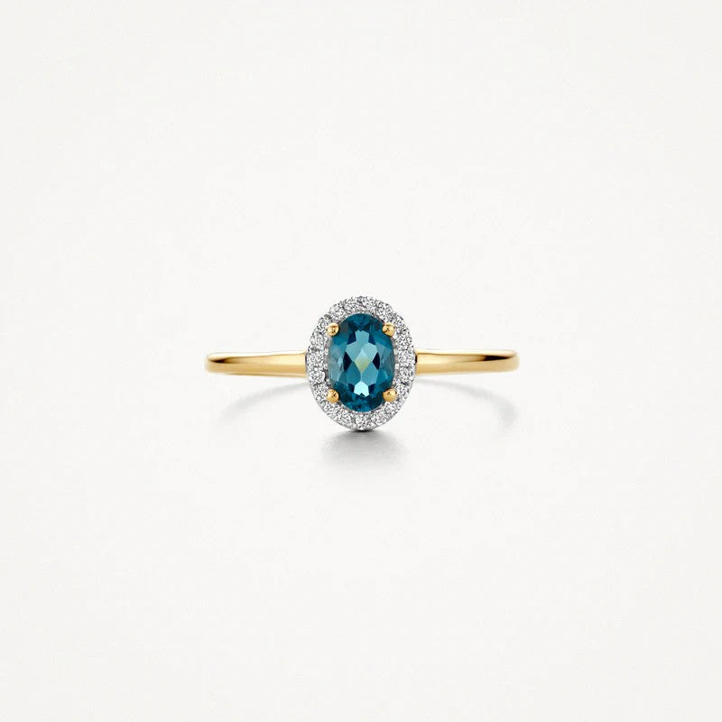 14 Karaat Geelgouden Ring met Blauwe Topaas en Diamant