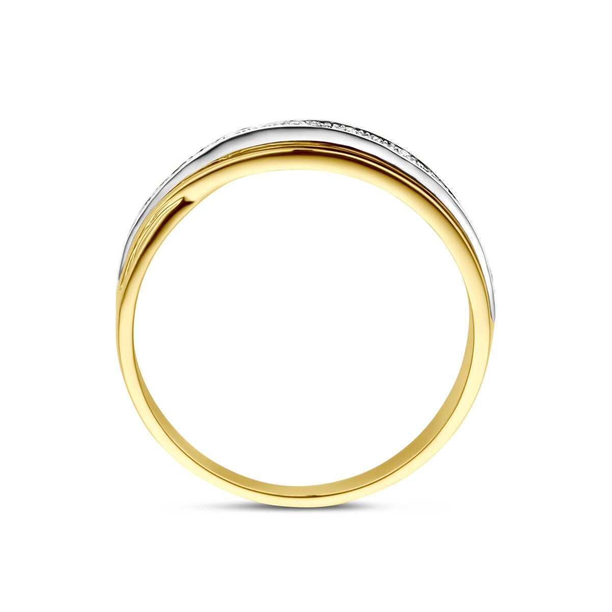 14k Bicolor geel en witgouden ring uitgevoerd met diamant. De ring heeft een breedte van 4mm en het diamantgewicht is 0.13ct. Steensoortdiamant Diamantgewicht (ct)0.13 Zuiverheidsi1 Slijpvormbriljant Diamant kleurh (wit) Steenkleurtransparant Zetwijzepave Metaalkleurgeel circa metaalgewicht (g)2.2 Ringmaat54 (17¼)