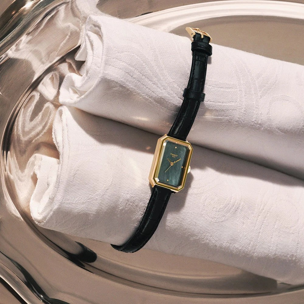 Productomschrijving **Tissot T-Lady SRV 30MM – Goud met parelmoer wijzerplaat** De Tissot SRV 30MM uit de elegante T-Lady collectie belichaamt pure vrouwelijkheid en Zwitserse klasse. Dit verfijnde dameshorloge heeft een rechthoekige goudkleurige kast van roestvrij staal met een diameter van 22 mm en een dikte van slechts 7,3 mm. De parelmoer wijzerplaat schittert subtiel bij elke lichtval en vormt samen met de goudkleurige wijzers een tijdloze, stijlvolle compositie. Binnenin bevindt zich het Zwitserse ETA 902.101 Quartz-uurwerk dat bekendstaat om zijn precisie en betrouwbaarheid. Dankzij de Renata R364 batterij biedt dit horloge een levensduur van circa 37 maanden, waardoor u jarenlang kunt genieten van zorgeloze tijdsweergave. Het krasbestendige saffierglas beschermt de wijzerplaat en zorgt voor een heldere glans. De zwarte leren band met goudkleurige gesp maakt het geheel compleet — een perfecte balans tussen elegantie en draagcomfort. Met een waterdichtheid van 5 bar is dit horloge bestand tegen dagelijks gebruik, inclusief douchen. **Specificaties:** * Kastdiameter: 22 mm * Kastdikte: 7,3 mm * Materiaal kast: Roestvrij staal, goudkleurig * Glas: Krasbestendig saffierglas * Uurwerk: ETA 902.101 Quartz (Swiss Made) * Batterij: Renata R364 – ca. 37 maanden levensduur * Band: Zwart leer met goudkleurige gesp * Waterdichtheid: 5 bar (geschikt om te douchen) * T160.110.36.126.00 De Tissot SRV 30MM is een ode aan verfijning — compact, stijlvol en met een subtiele glans die elke outfit versterkt. **Tissot – tijdloze elegantie met Zwitserse precisie.** Dé Juwelier van het Groene Hart en Waddinxveen. Tissot SRV 30MM Dameshorloge – Goud & Parelmoer | Juweliershuys van Veen Simons Ontdek de Tissot SRV 30MM uit de T-Lady collectie: een goudkleurig dameshorloge met parelmoer wijzerplaat, zwart leren band en Zwitsers quartz-uurwerk. Verkrijgbaar bij dé Juwelier van het Groene Hart en Waddinxveen.