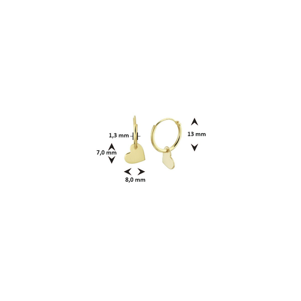 14k Geelgouden oorringen uitgevoerd met een hanger in de vorm van een hartje. De oorringen hebben een diameter van 13mm. Het hartje heeft een afmeting van 7x8mm.