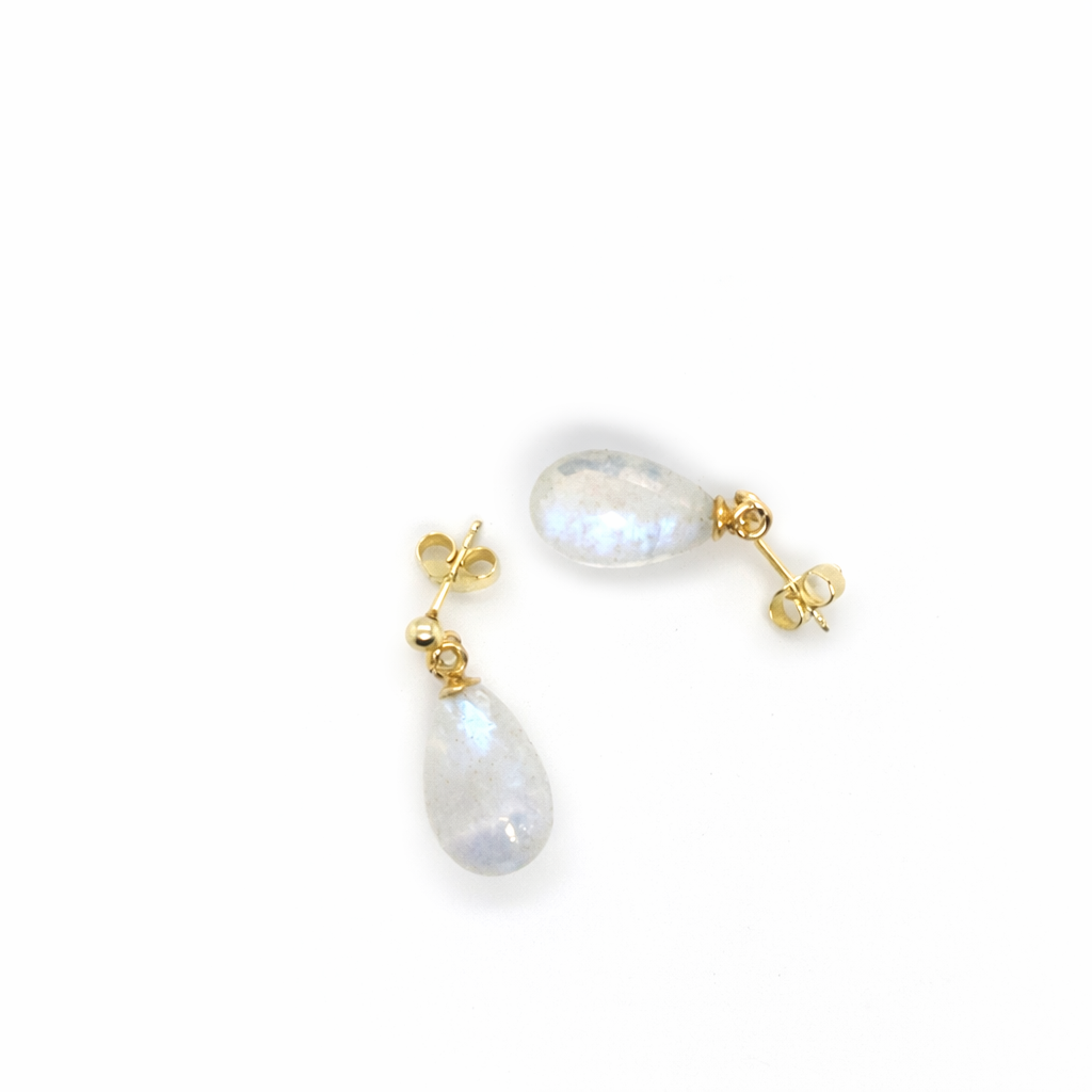 14 kt Gouden Oorstekers met Regenboog Maansteen Hangers – Briolette