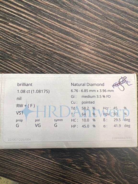 14 kt witgouden ring gezet met een HRD certified diamant 1.08 ct F VS1