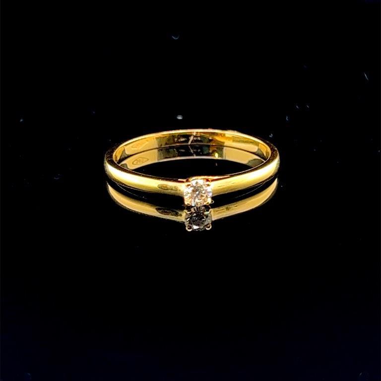 14 karaats gouden solitairring bezet met een briljant geslepen diamant. Gewicht van de ring: ca. 1,9 gram Diamant: Slijpvorm: Briljant Kleur: Wesselton Zuiverheid: SI Gewicht: 0,10 caraat