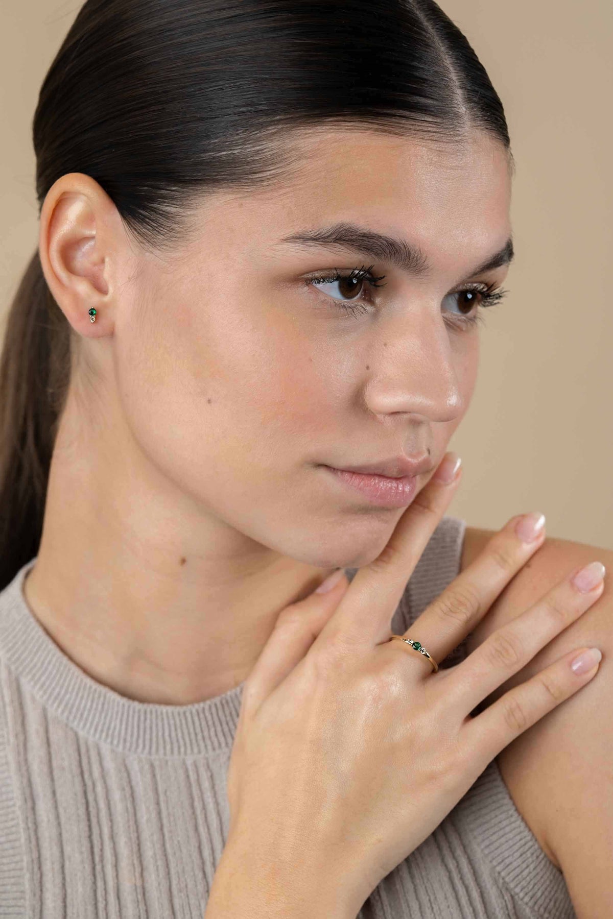 Deze ring combineert kleur, elegantie en verfijnd vakmanschap. De groene steen geeft een luxe uitstraling, terwijl de champagnekleurige accenten zorgen voor subtiele sprankeling. Perfect voor dagelijks gebruik én speciale momenten.